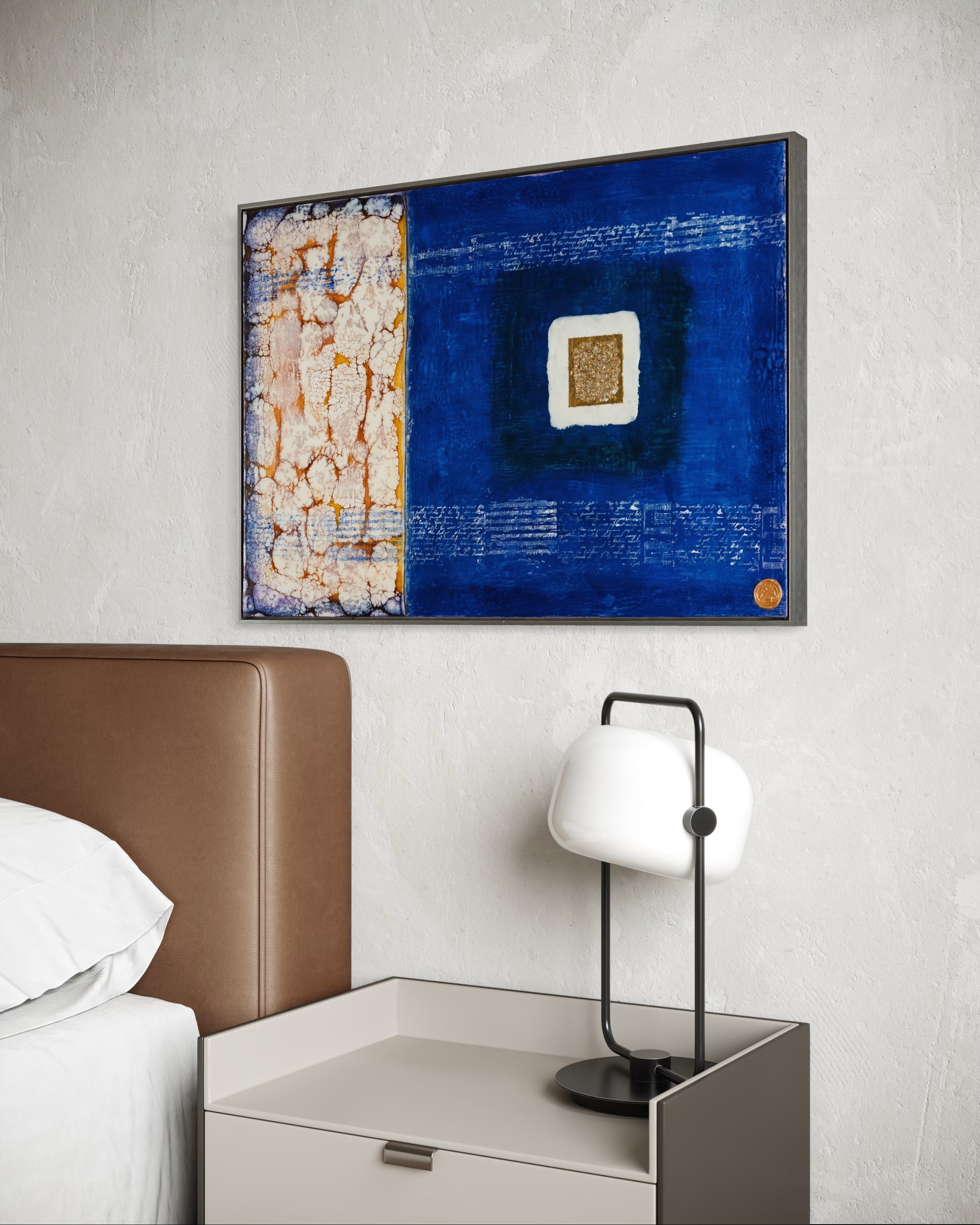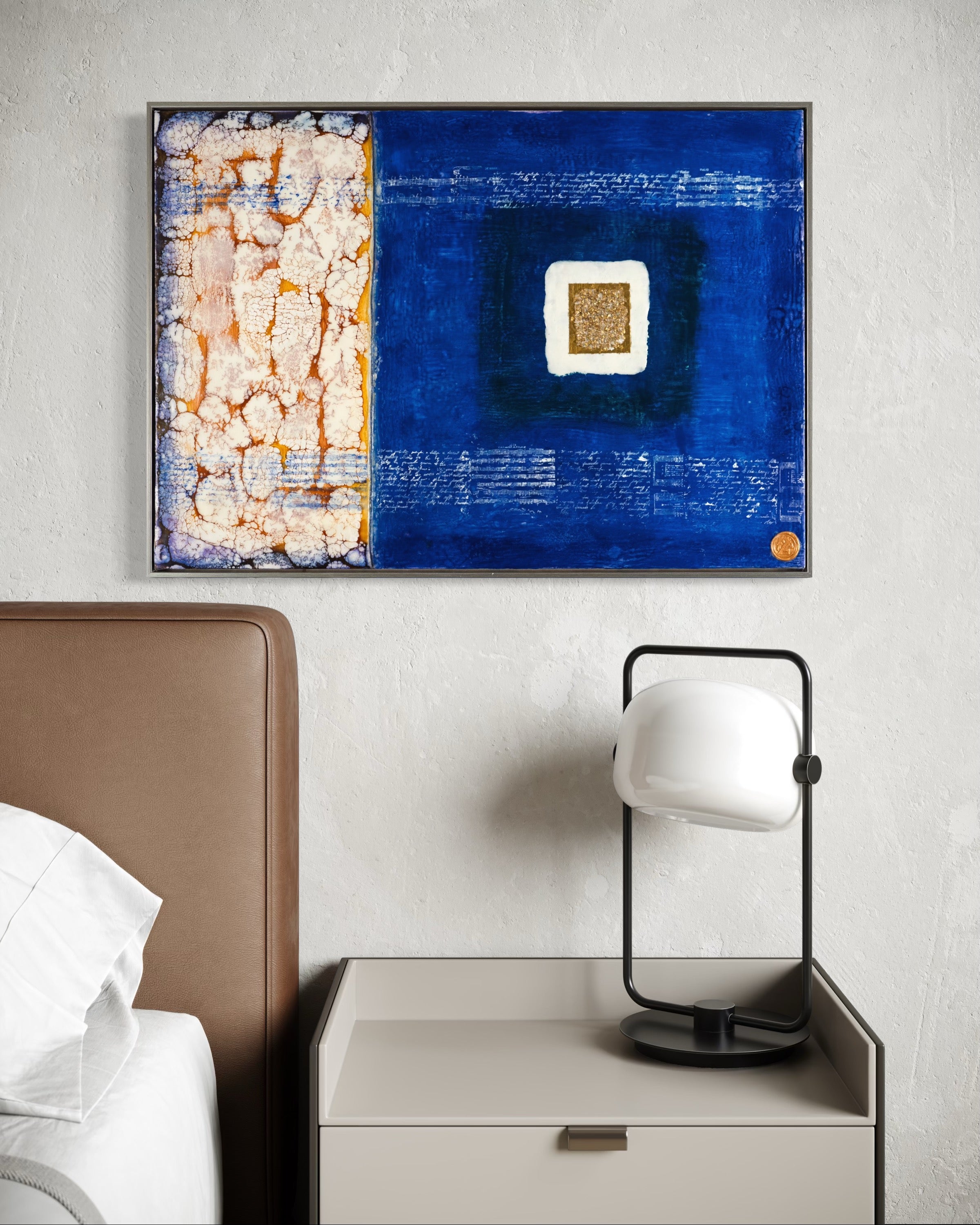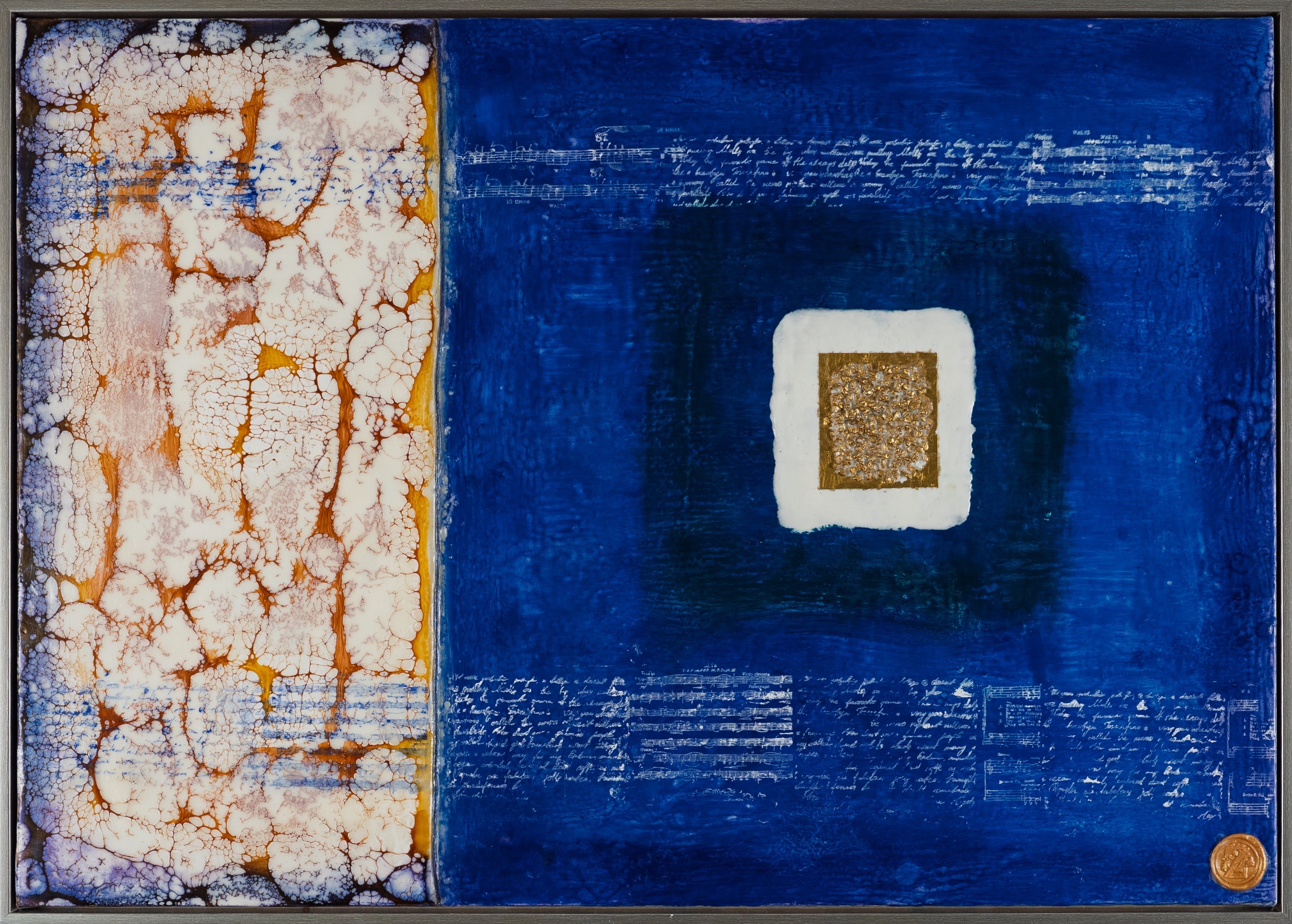 This serene encaustic piece honors the spirit of art and literature. The textured golden section on the left suggests the richness of written words and creative expression, while the deep, contemplative blue evokes the vast, open space of imagination. At the center, a small, intricate square symbolizes the core of artistic inspiration—quiet, focused, and enduring. The composition celebrates the timeless connection between creativity and reflection.