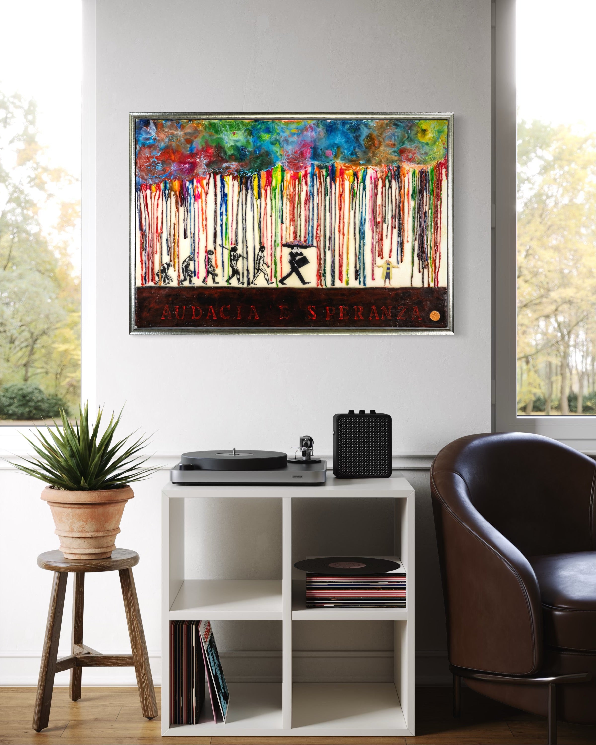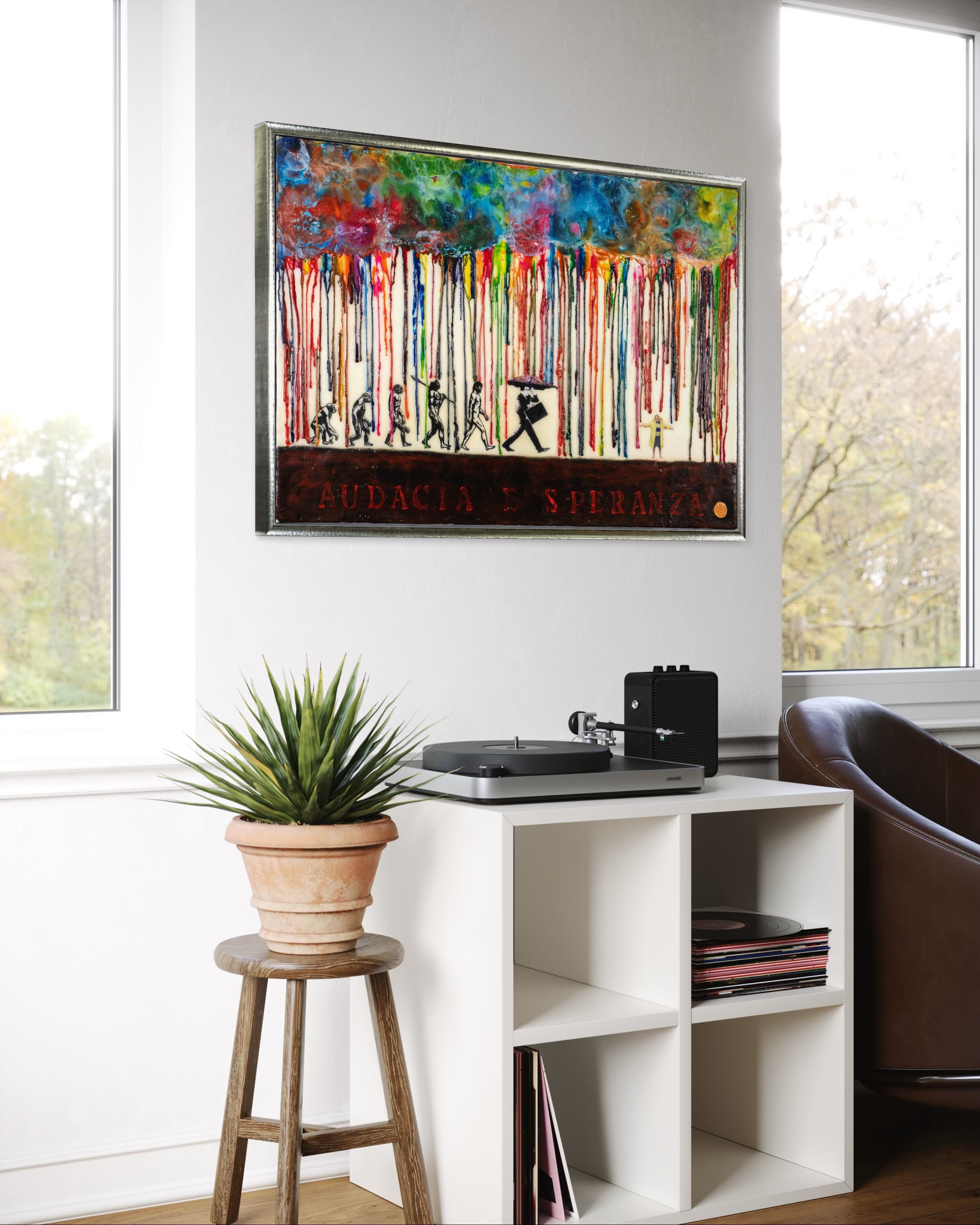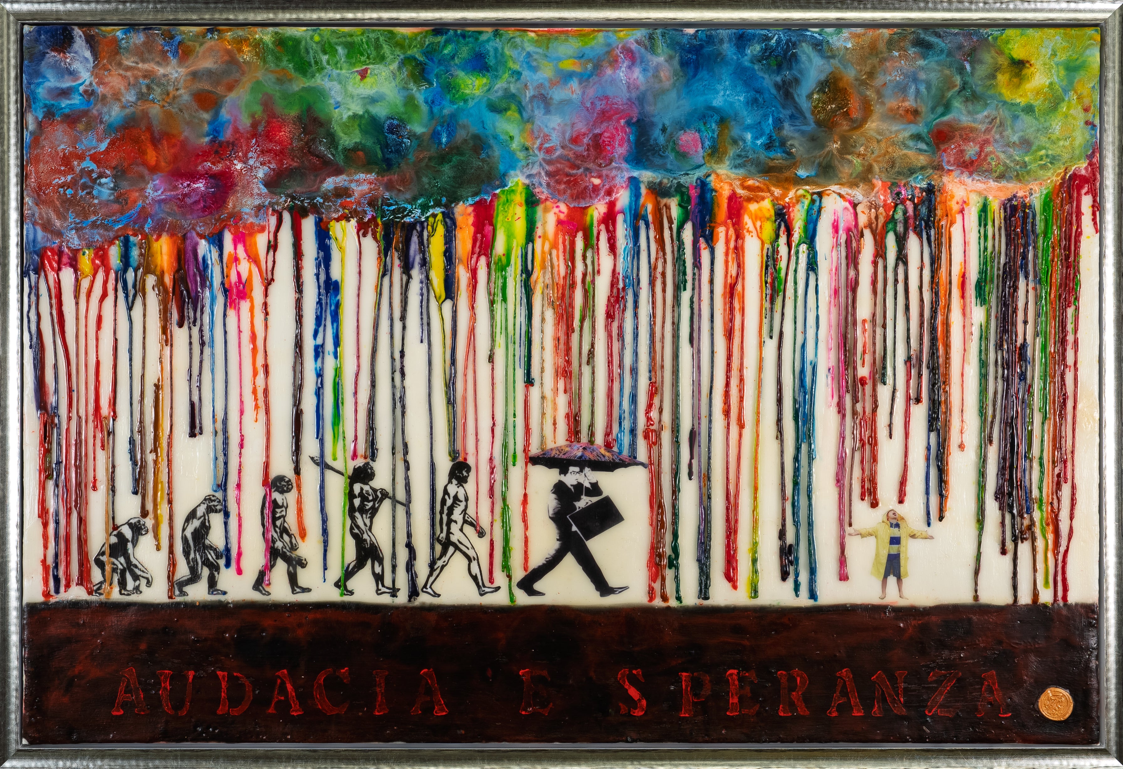 “Audacity and Hope,” this encaustic artwork beautifully captures the journey of humanity beneath a vibrant, celestial sky. Colorful clouds shower a cascade of hues—like life’s endless possibilities—while below, figures evolve from our primal ancestors to the modern, buttoned-up figure shielded by an umbrella. In our pursuit of progress, we’ve grown guarded and disconnected from the raw beauty of life that surrounds us. Yet, the child stands open and free, embracing the colorful rain, reminding us of our origins—and the bold, hopeful spirit we risk leaving behind beneath the expansive, glowing sky.