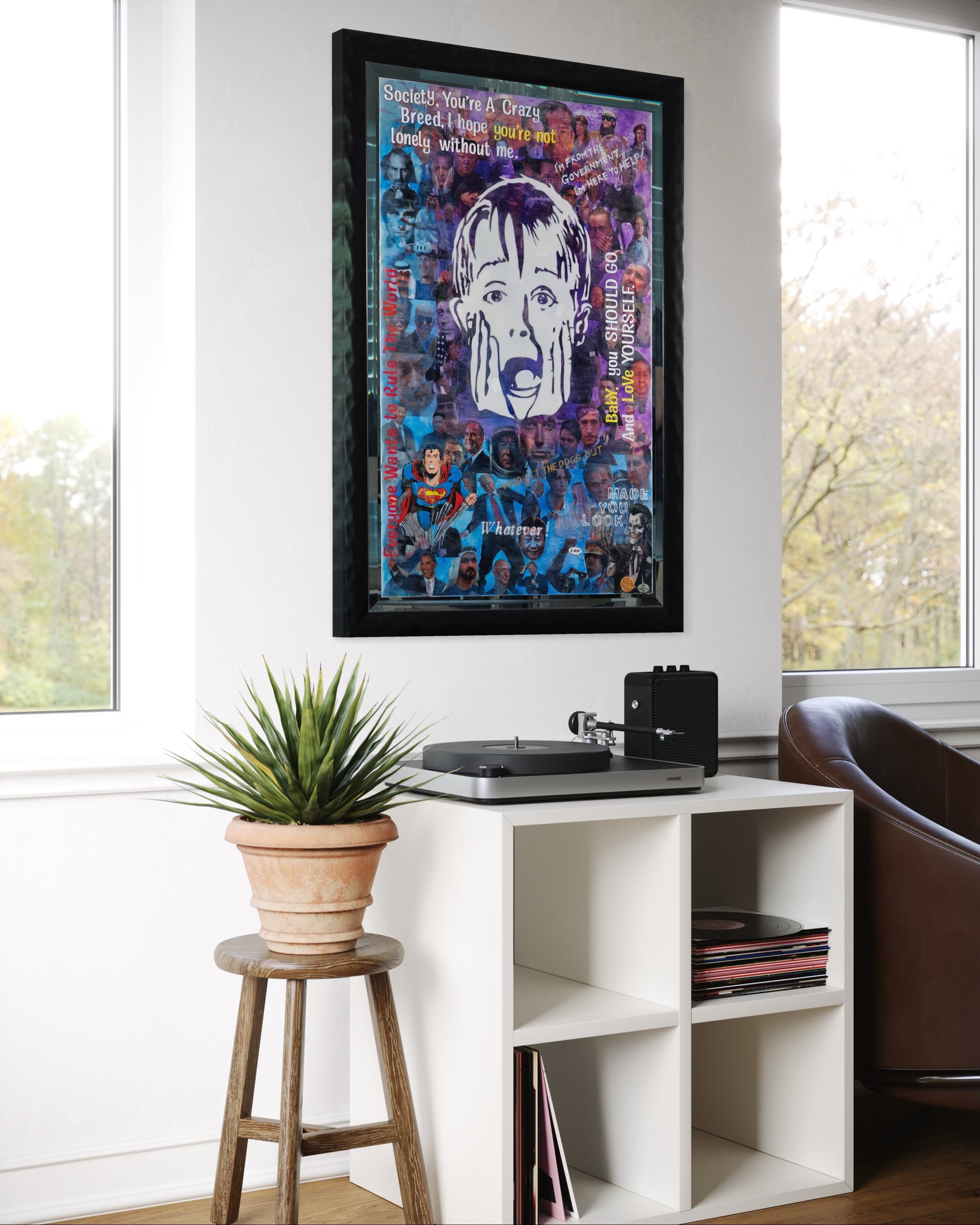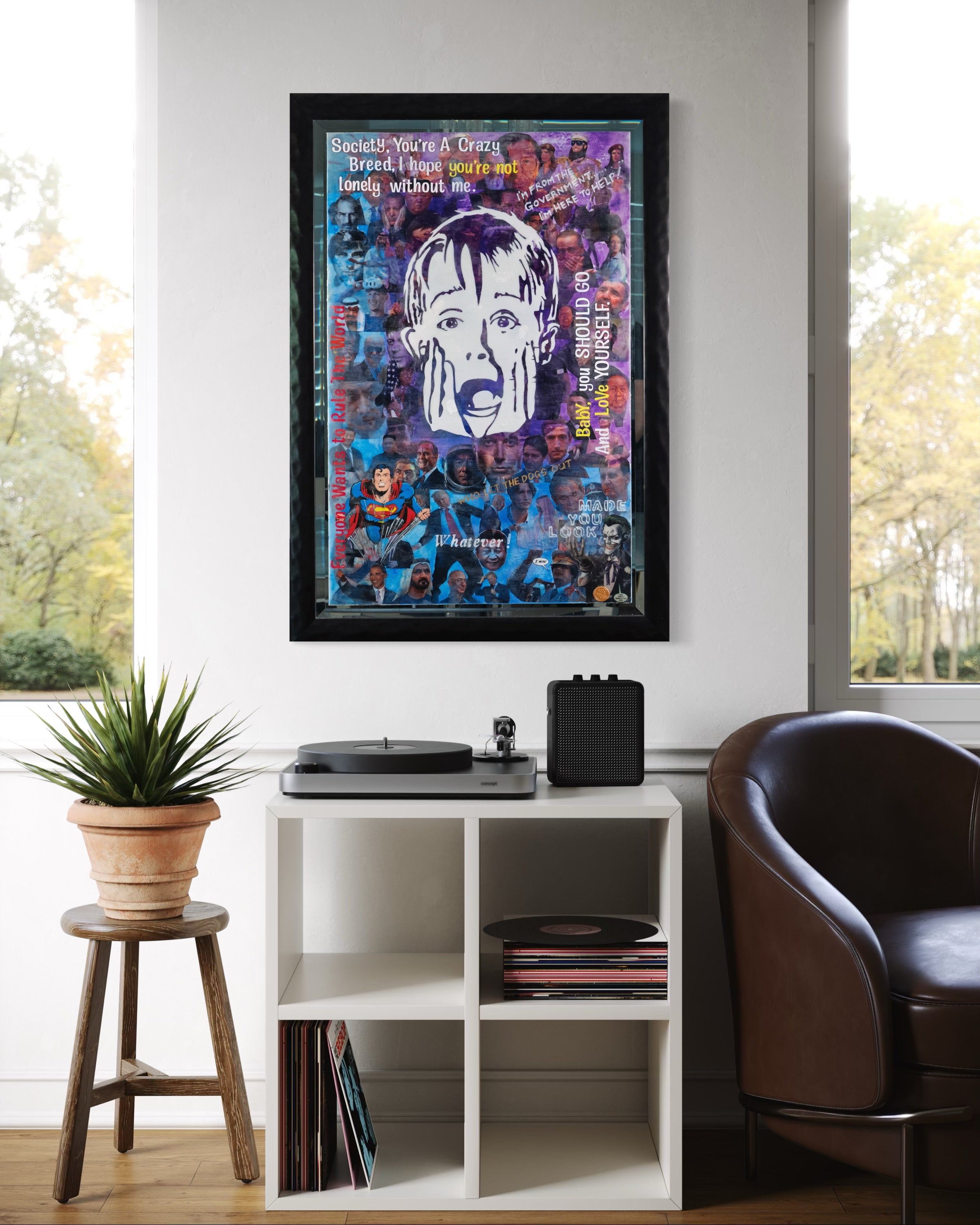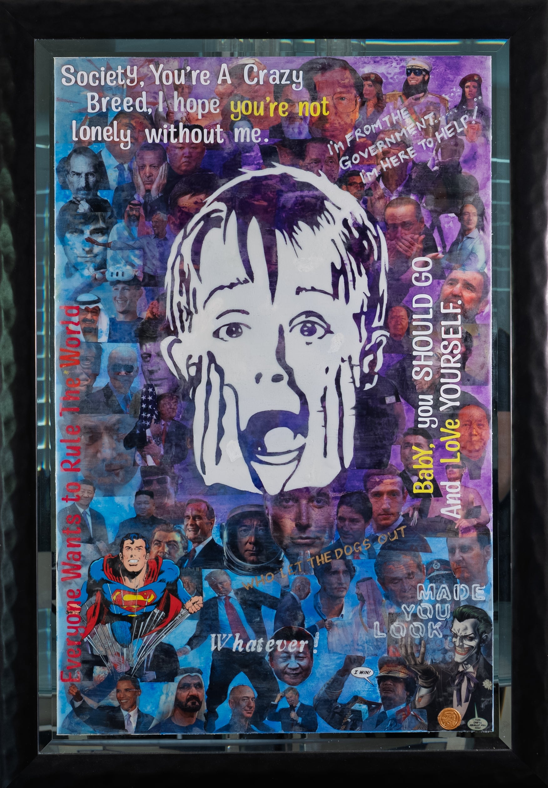 Inspired by the phrase "Everyone Wants to Rule the World," this encaustic wax collage layers bold color, texture, and familiar imagery to explore power, fame, and influence. At its center, a striking depiction of the iconic scream from Home Alone captures a sense of chaos and awe, surrounded by a dense mosaic of cultural figures and caricatures who’ve shaped the last 60 years. From superheroes to politicians, musicians to media icons, the piece satirizes the scramble for control while honoring the pop legacy of our time.