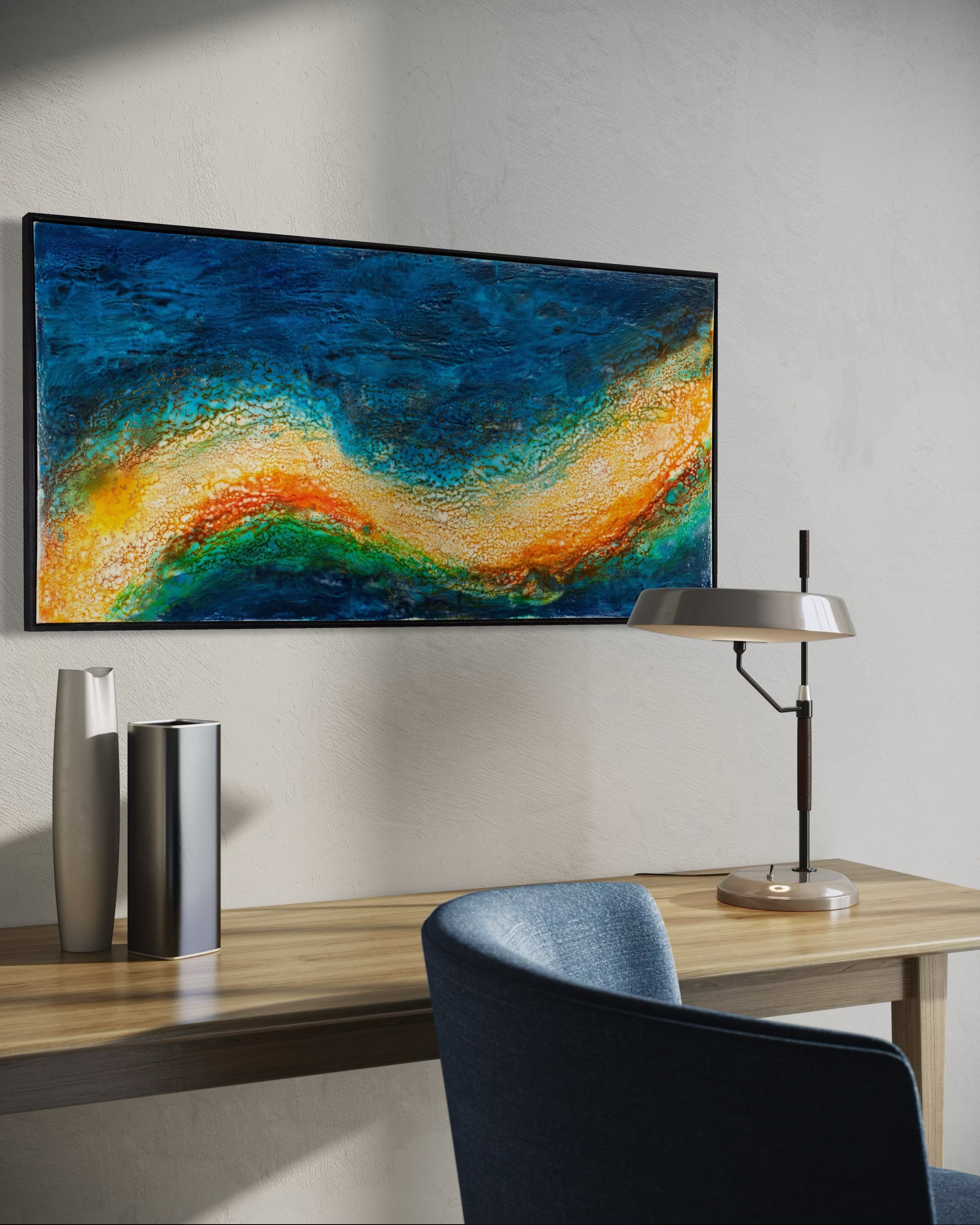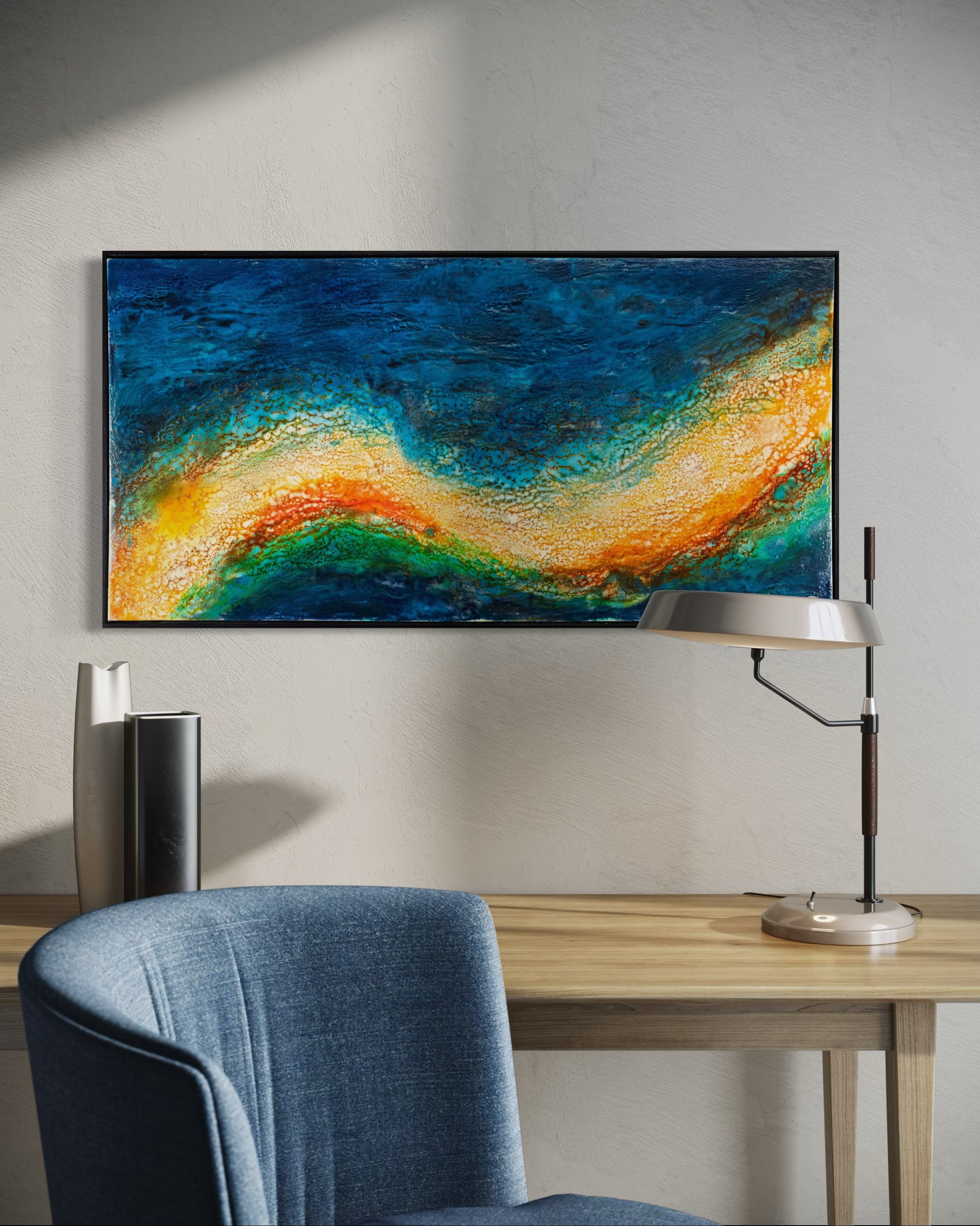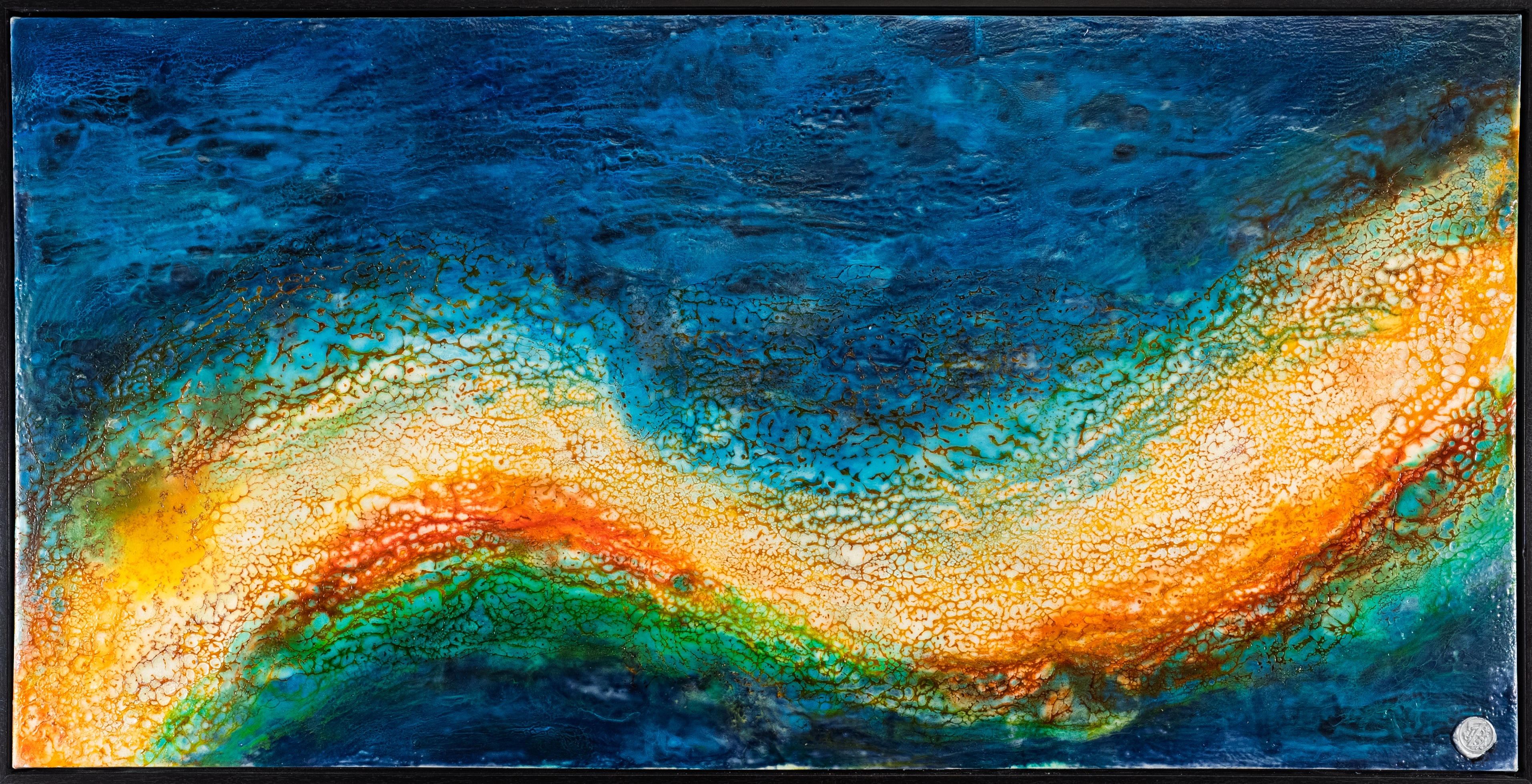 This richly textured encaustic painting seduces the eye with undulating curves and deep, saturated colour. Hints of sea and sky merge in a sensual dance—golden light flowing through velvety blues and lush greens like the caress of water on skin. It invites the viewer to lose themselves in its rhythmic current, to feel rather than see, and to surrender to the tide of emotion it stirs.