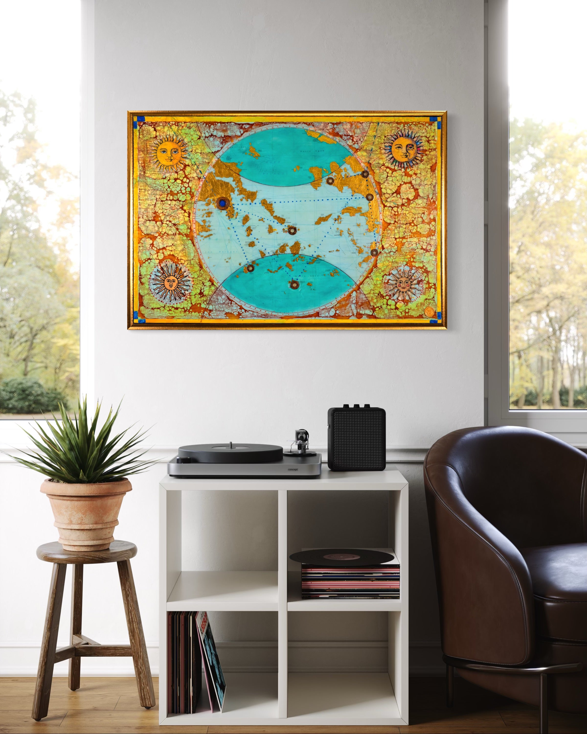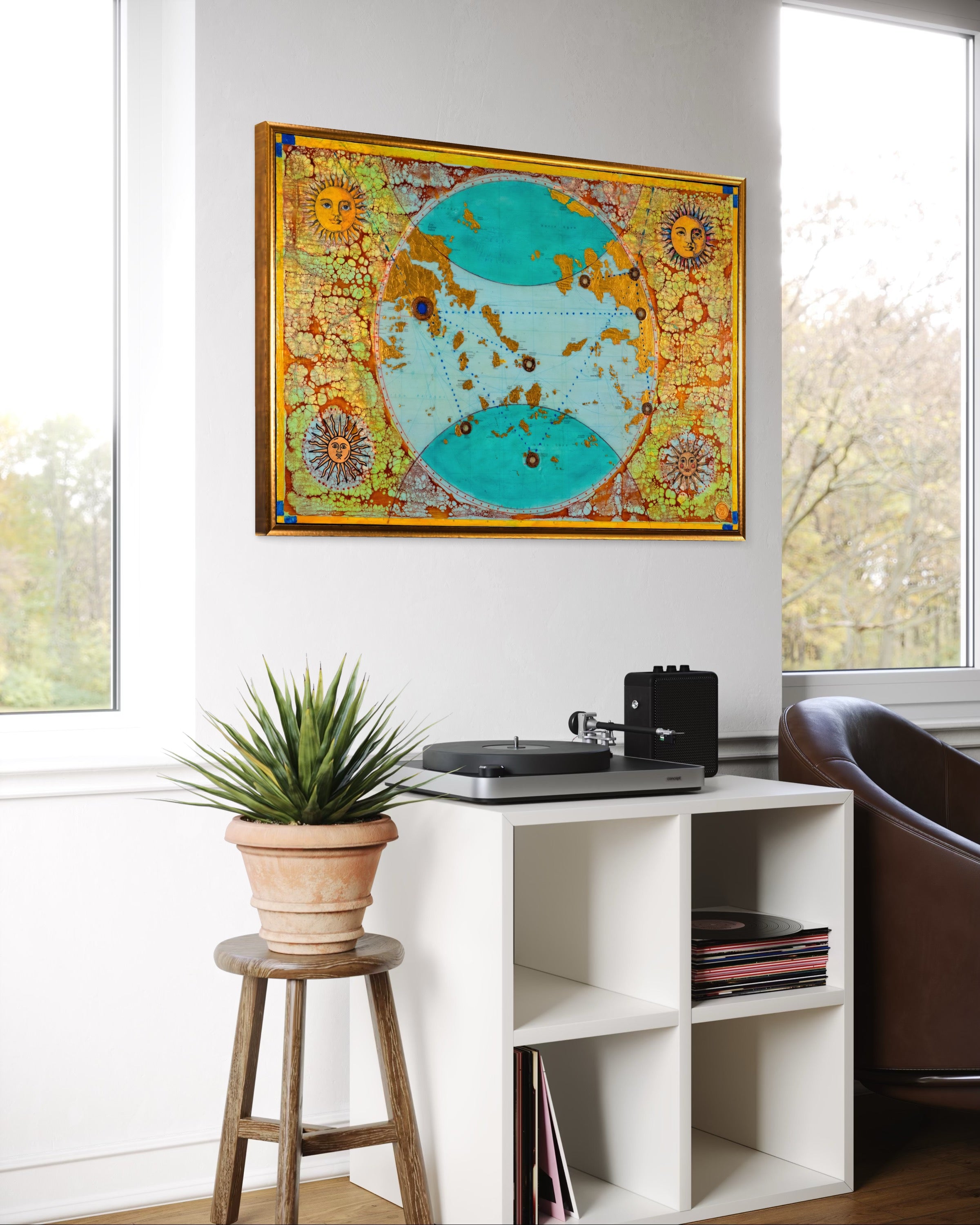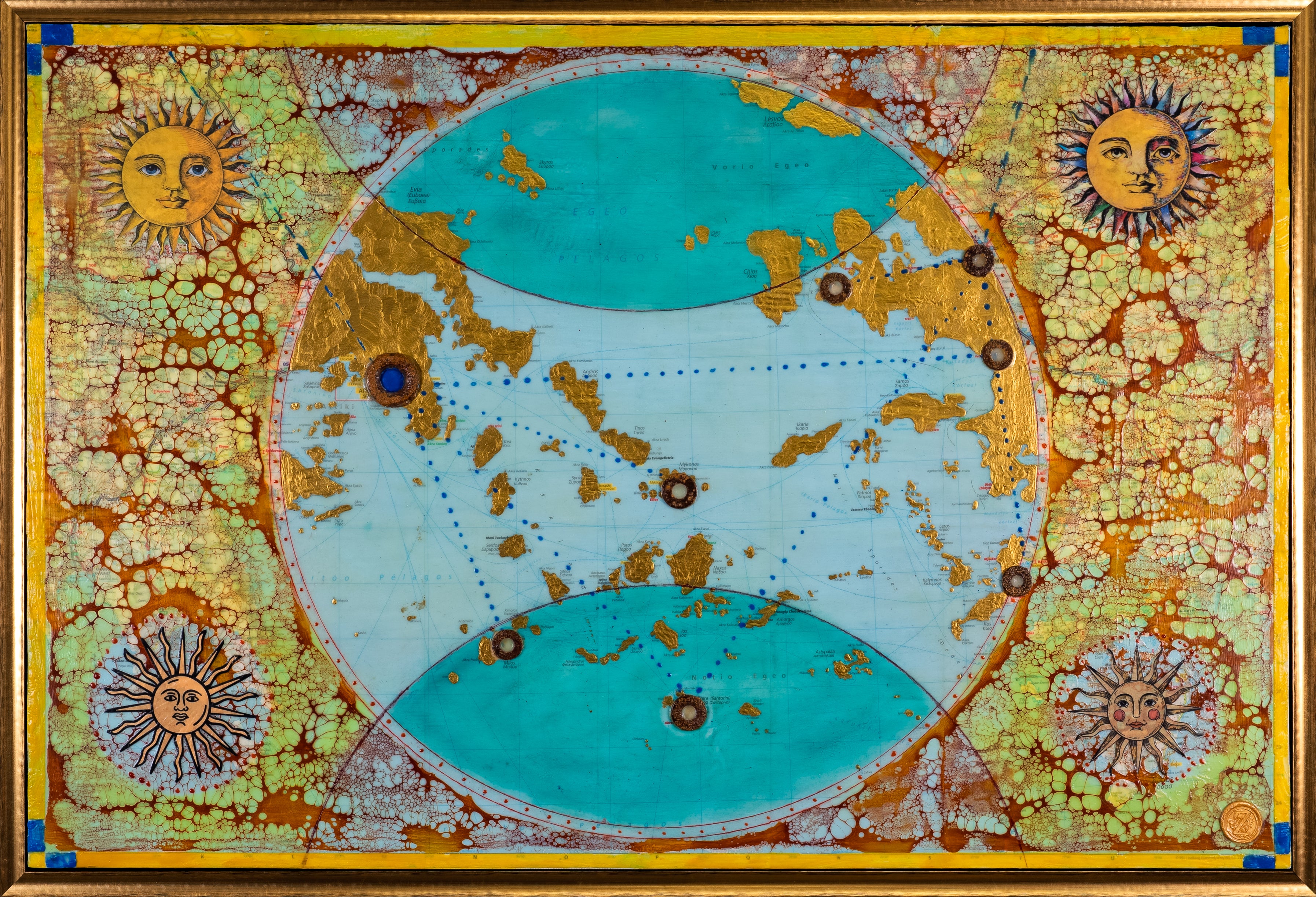 This vibrant encaustic artwork captures the cradle of Western civilization—the Mediterranean—through a stylized globe form centered on Greece, the Greek islands, Turkey, and surrounding waters. The turquoise sea flows with life and history, contrasted by rich golds and earthy browns that shape the ancient coastlines. The sun and celestial motifs in each corner evoke time, mythology, and cosmic influence, reinforcing the region's historical depth. Swirling patterns in the background echo the layered cultures that emerged here—philosophy, art, trade, and storytelling—all born from this luminous, interconnected sea. The globe shape emphasizes the enduring centrality of this region in shaping the world.