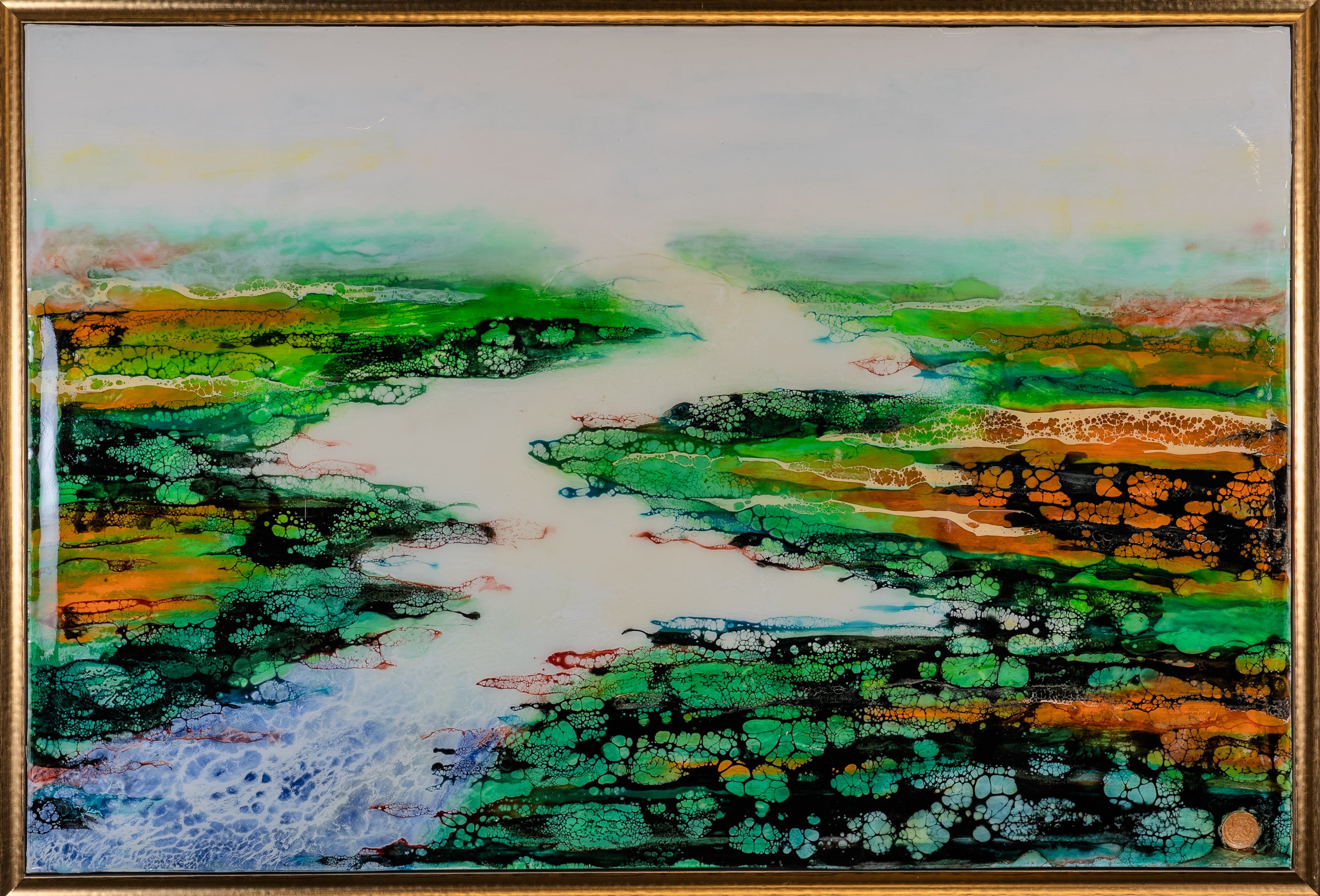 This encaustic artwork beautifully captures a misty landscape with a river winding through lush, rolling hills. Vibrant greens and earthy browns blend seamlessly with soft blues and whites, drawing the viewer deep into the scene. The delicate washes of pale color create a sense of depth and mystery, inviting quiet reflection on the timeless beauty and spirit of the countryside.