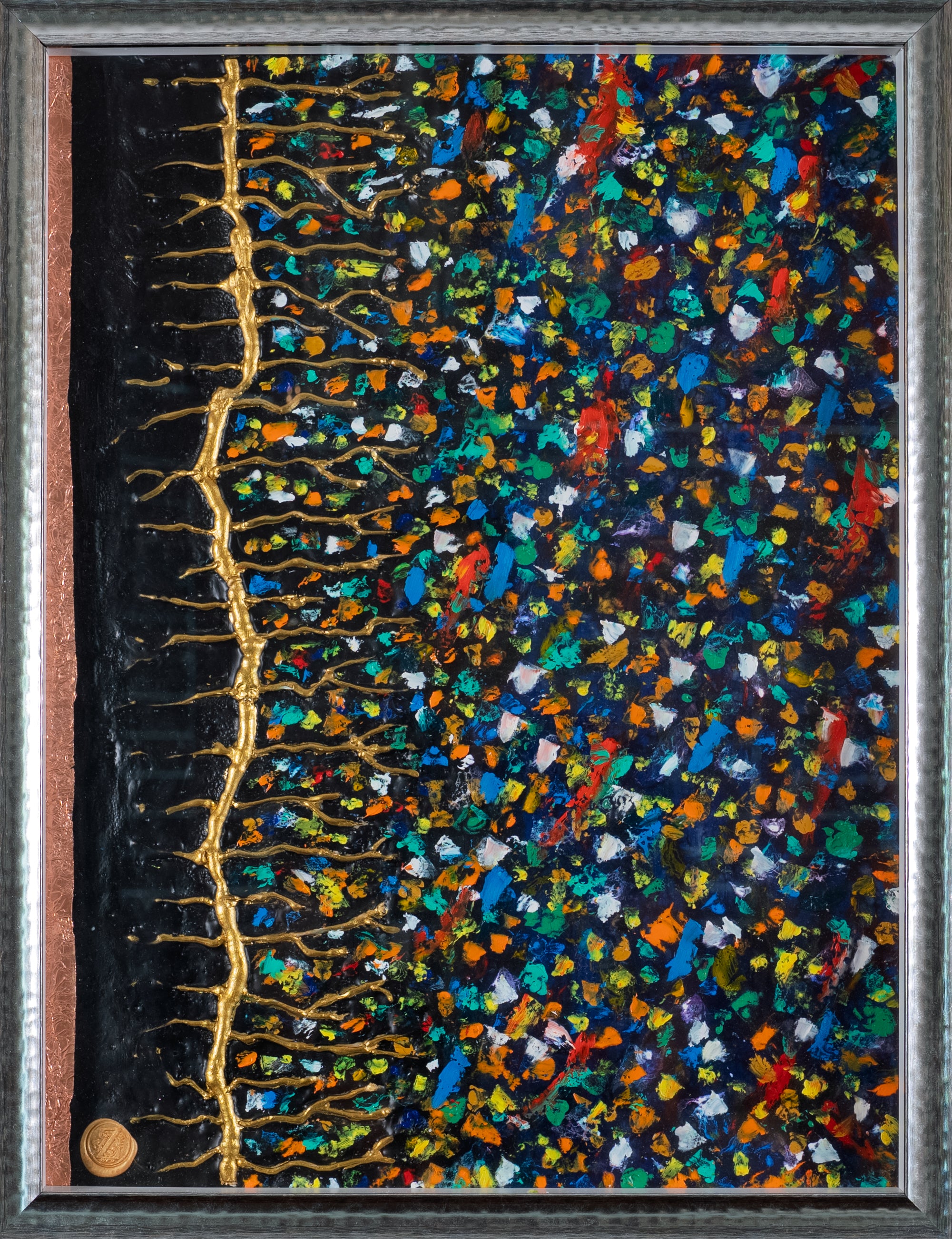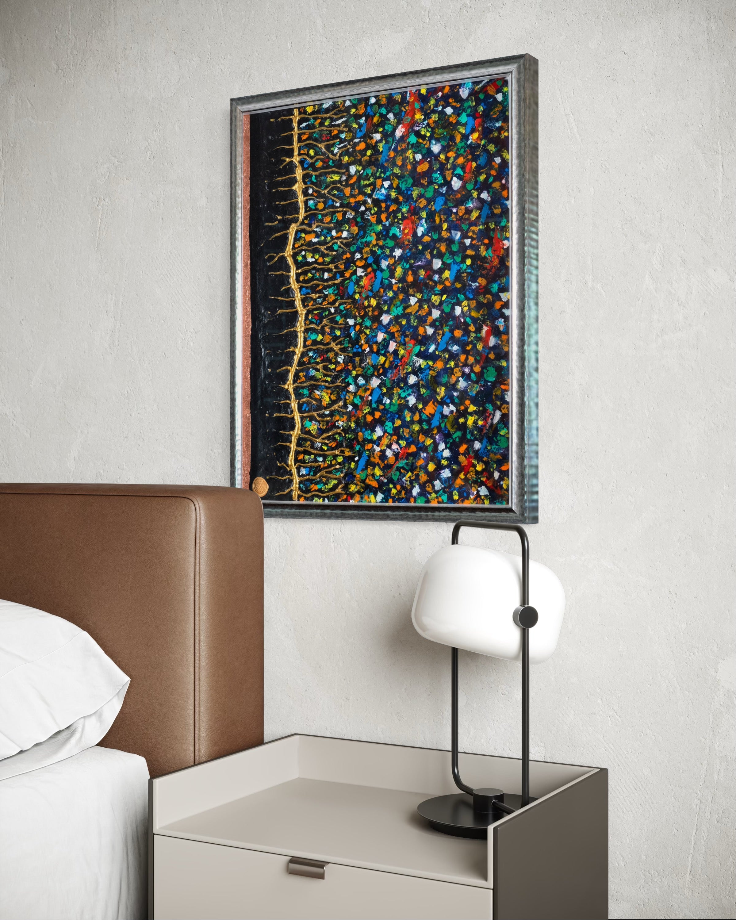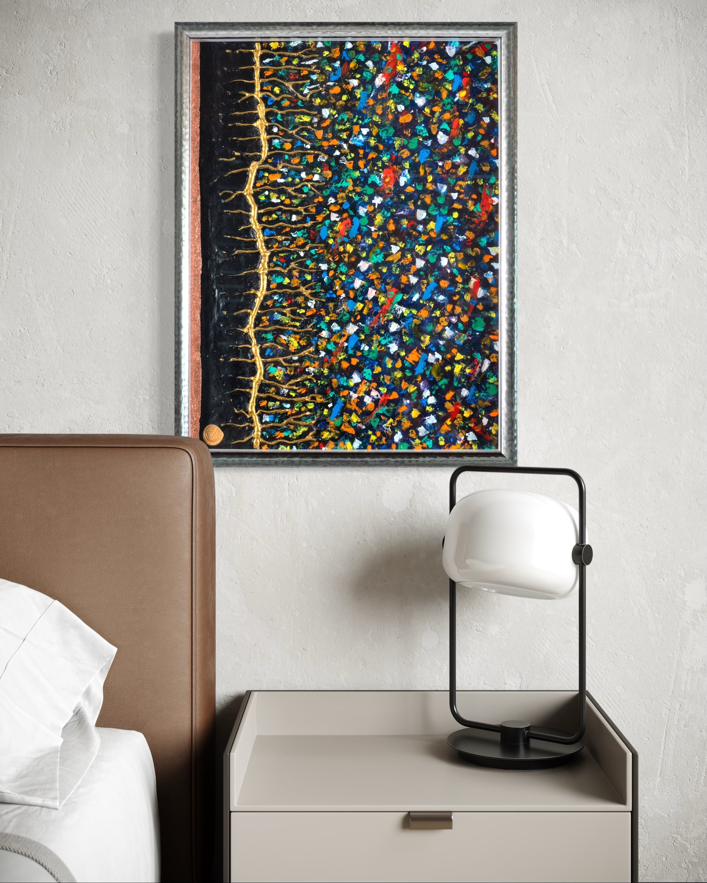 This encaustic artwork presents a kaleidoscope of vibrant colors contrasted sharply against a dark, earthy background. The composition is divided yet connected by golden, organic forms resembling tree-like fingers that reach across the divide. These luminous strands create a dynamic tension, symbolizing connection and growth emerging from the grounded darkness, weaving life and energy between two contrasting realms.