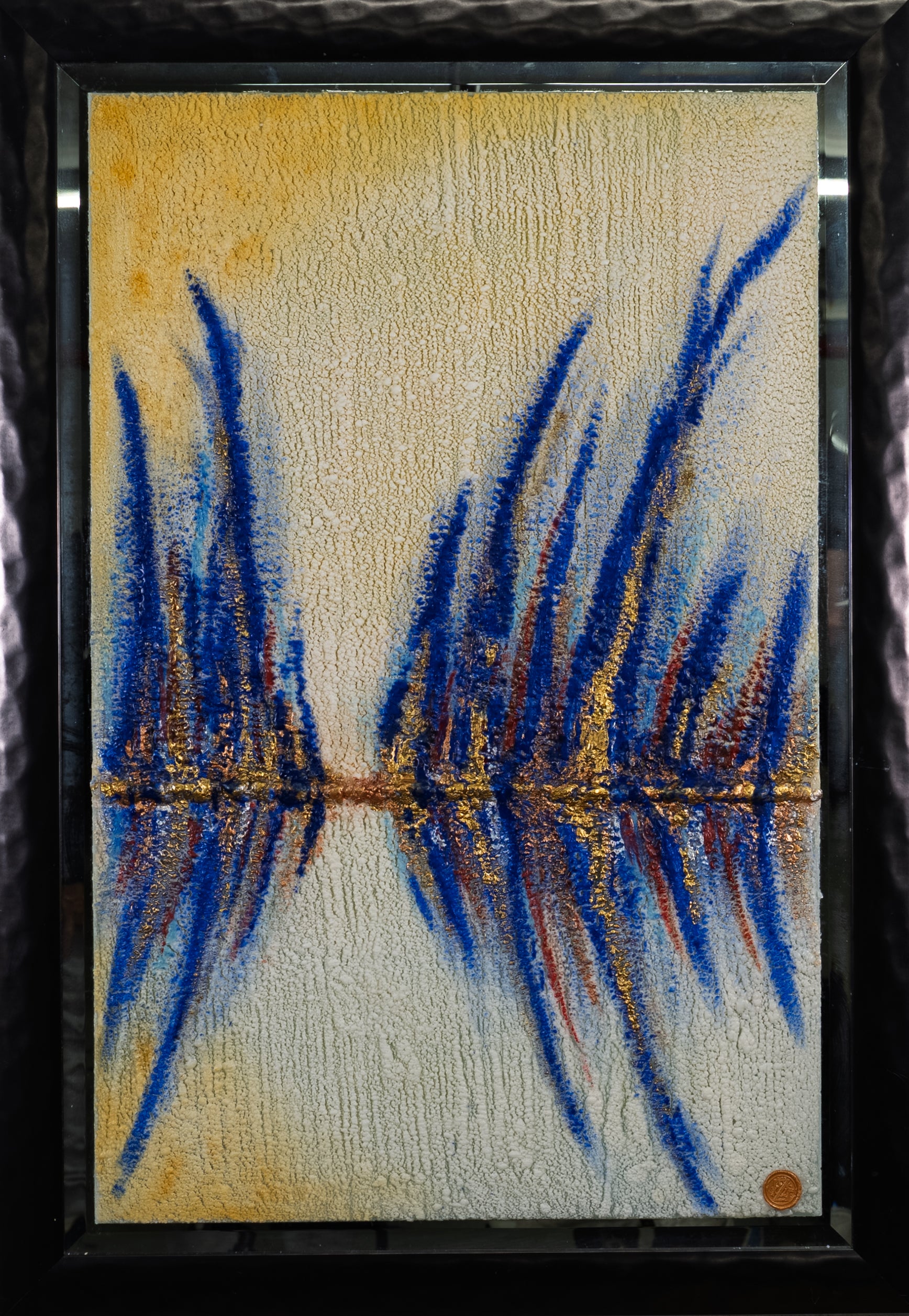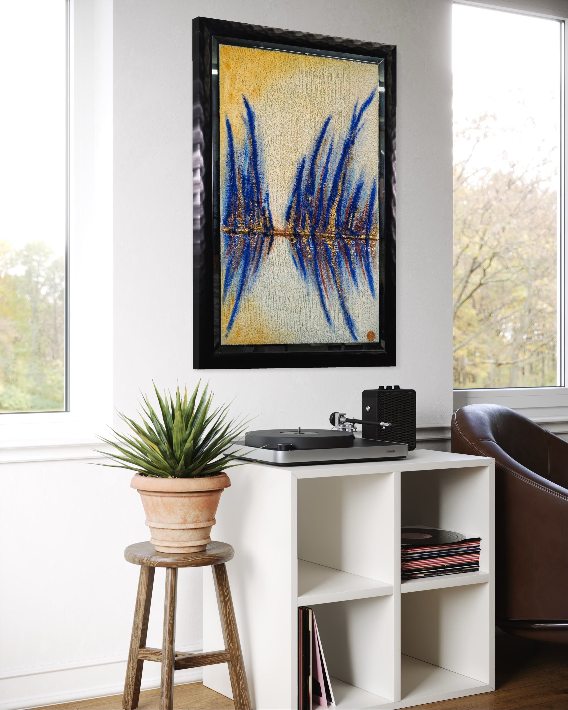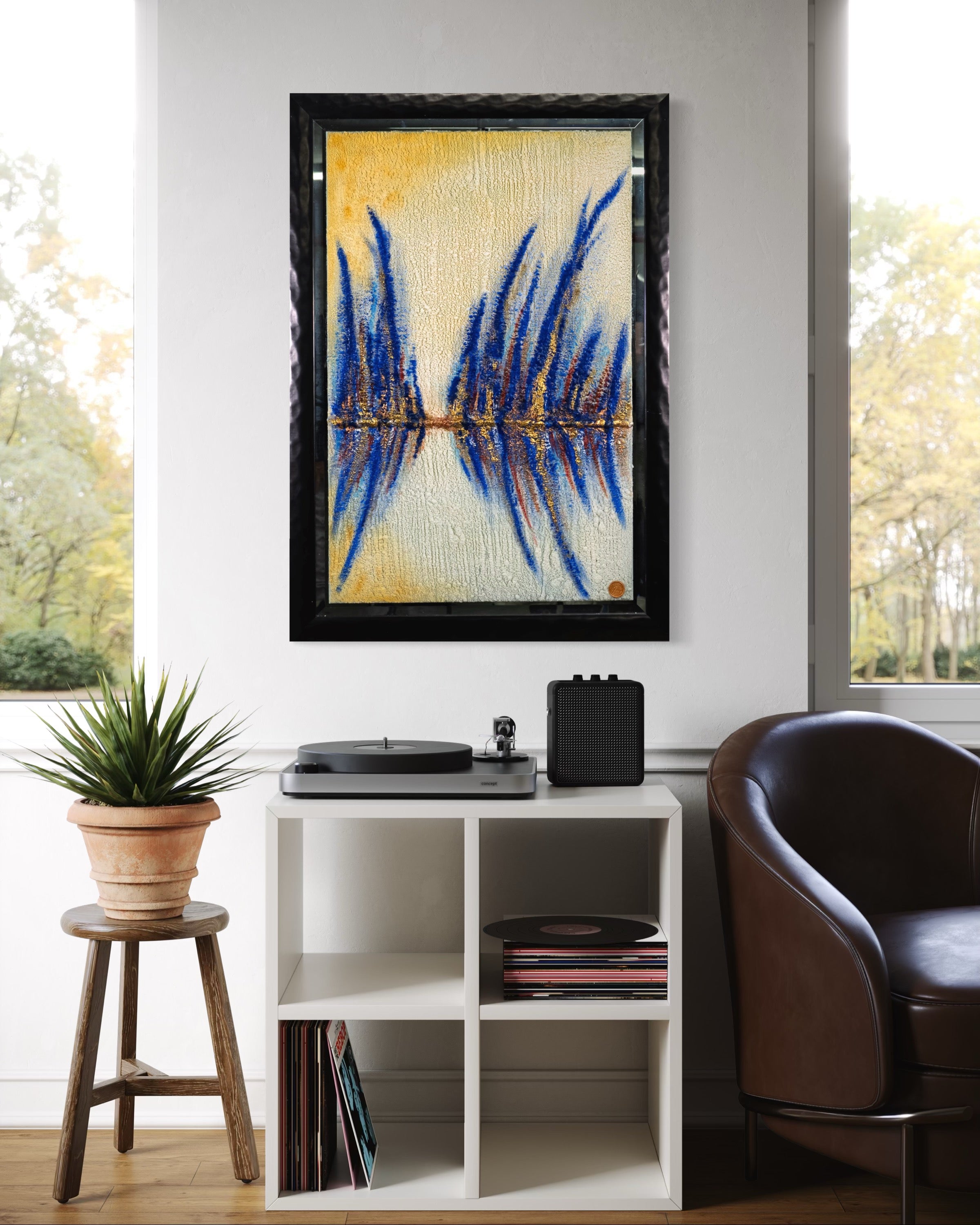 This piece captures the delicate dance of reflections, where textured layers blur the boundaries between water and landscape. The deep blues and golden tones ripple and merge, creating an almost dreamlike scene that invites contemplation and a sense of serene mystery. Perfect for anyone drawn to nature’s subtle, shifting beauty.
