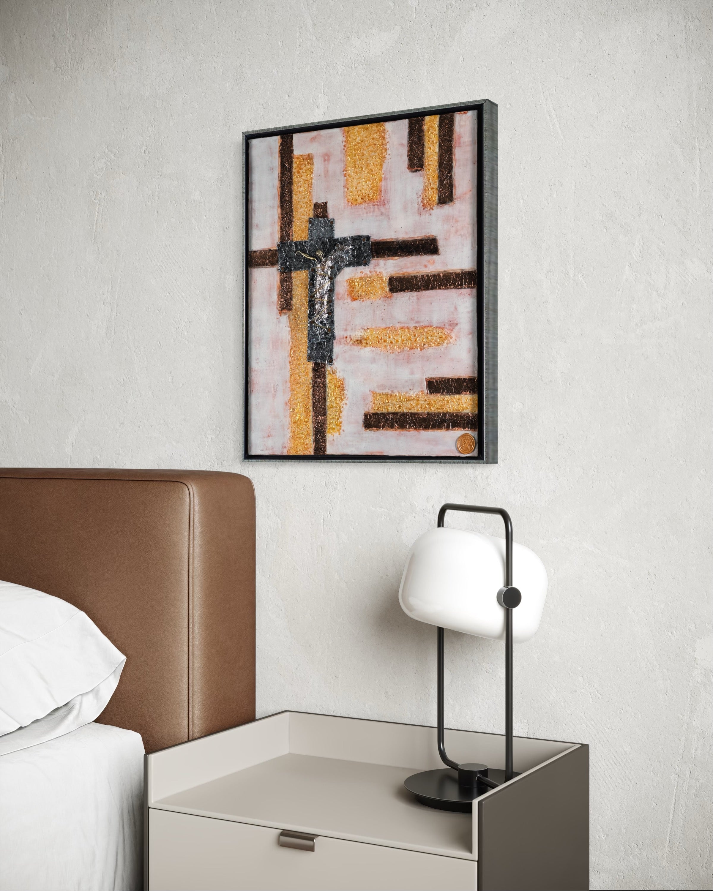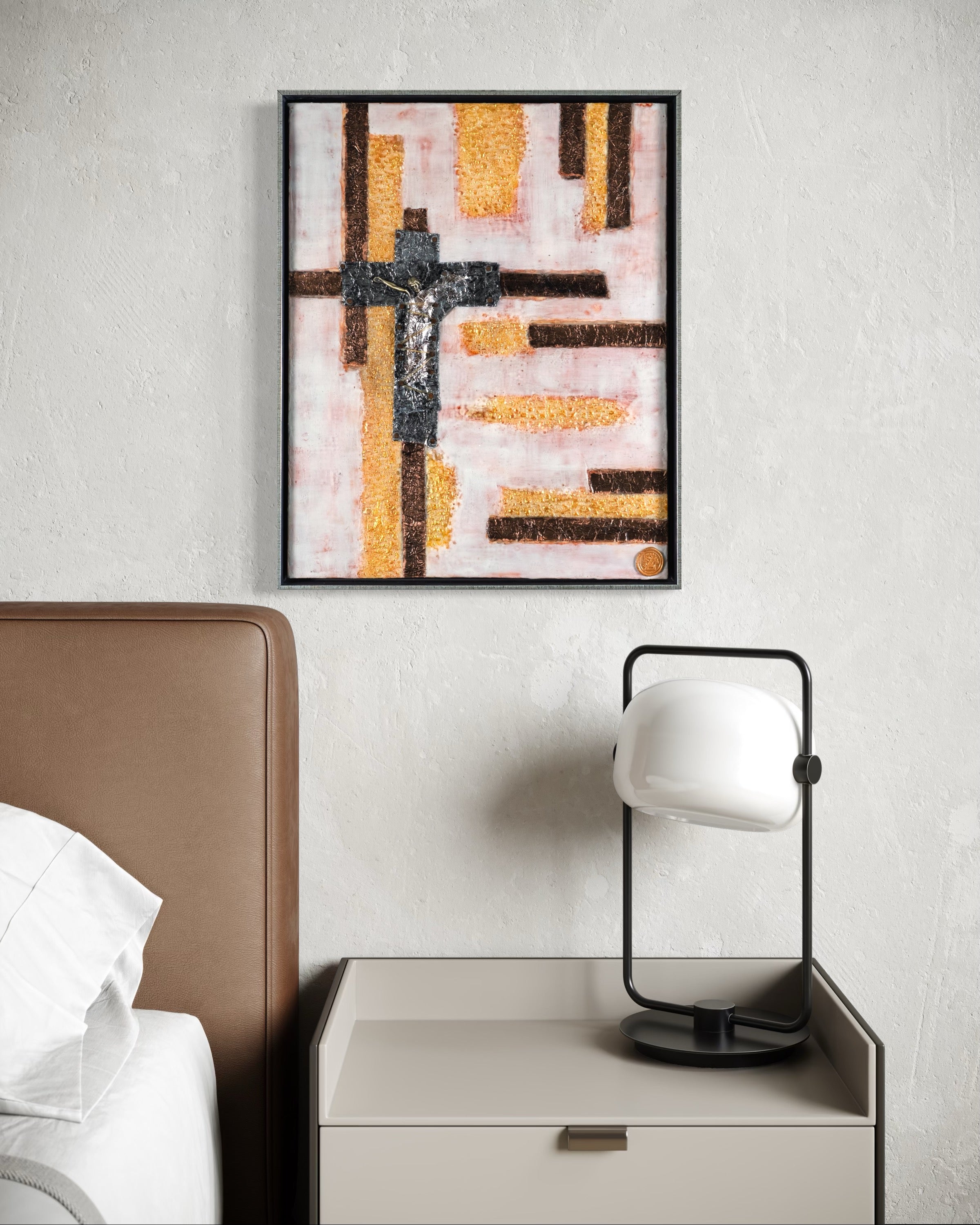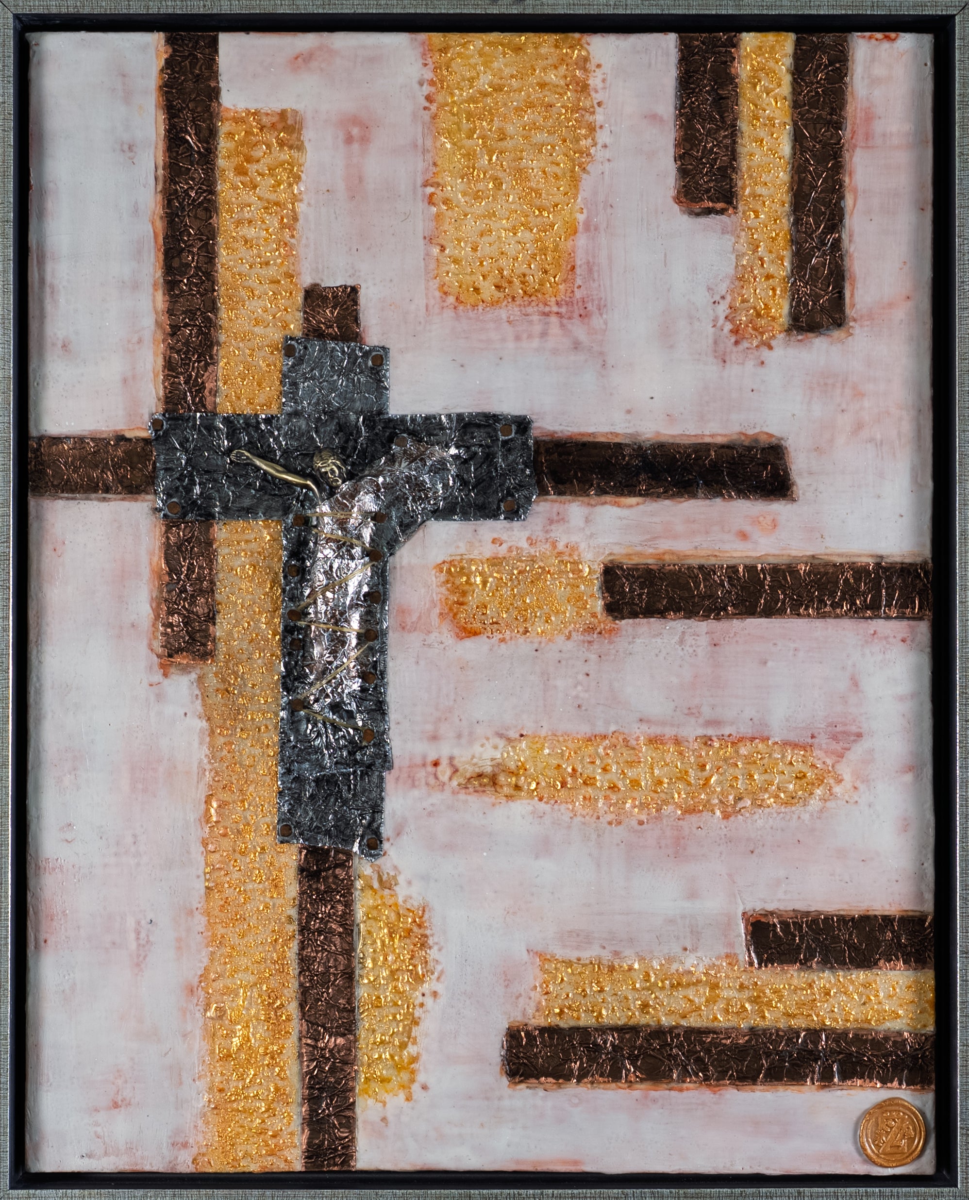 The crucifix wrapped in metal and tightly bound, symbolizing restraint and oppression. Yet, its message of sacrifice and hope breaks through. The soft pink background contrasts with bold gold and copper bands, highlighting both vulnerability and enduring strength, with textured gold evoking light and divinity that persists despite confinement.