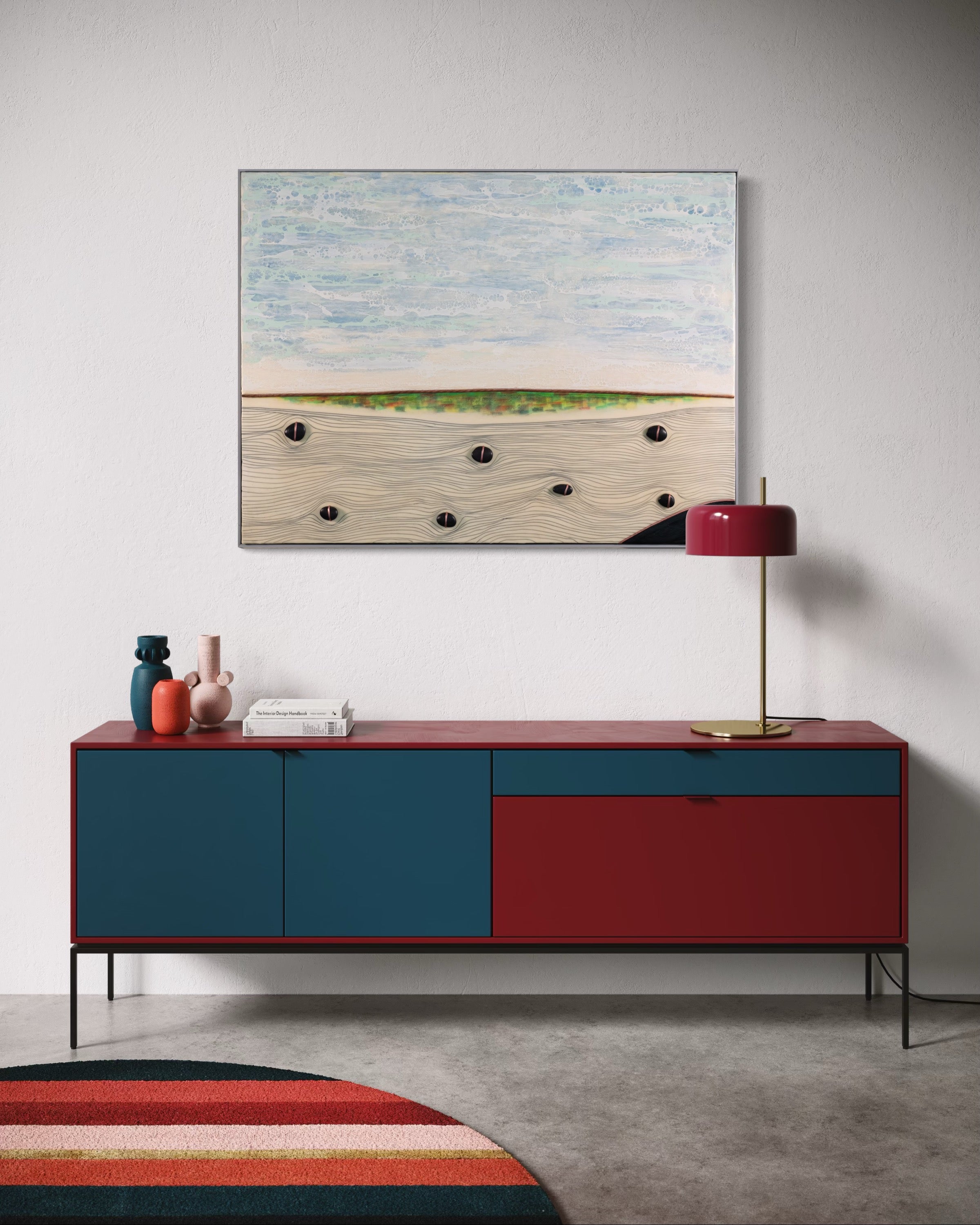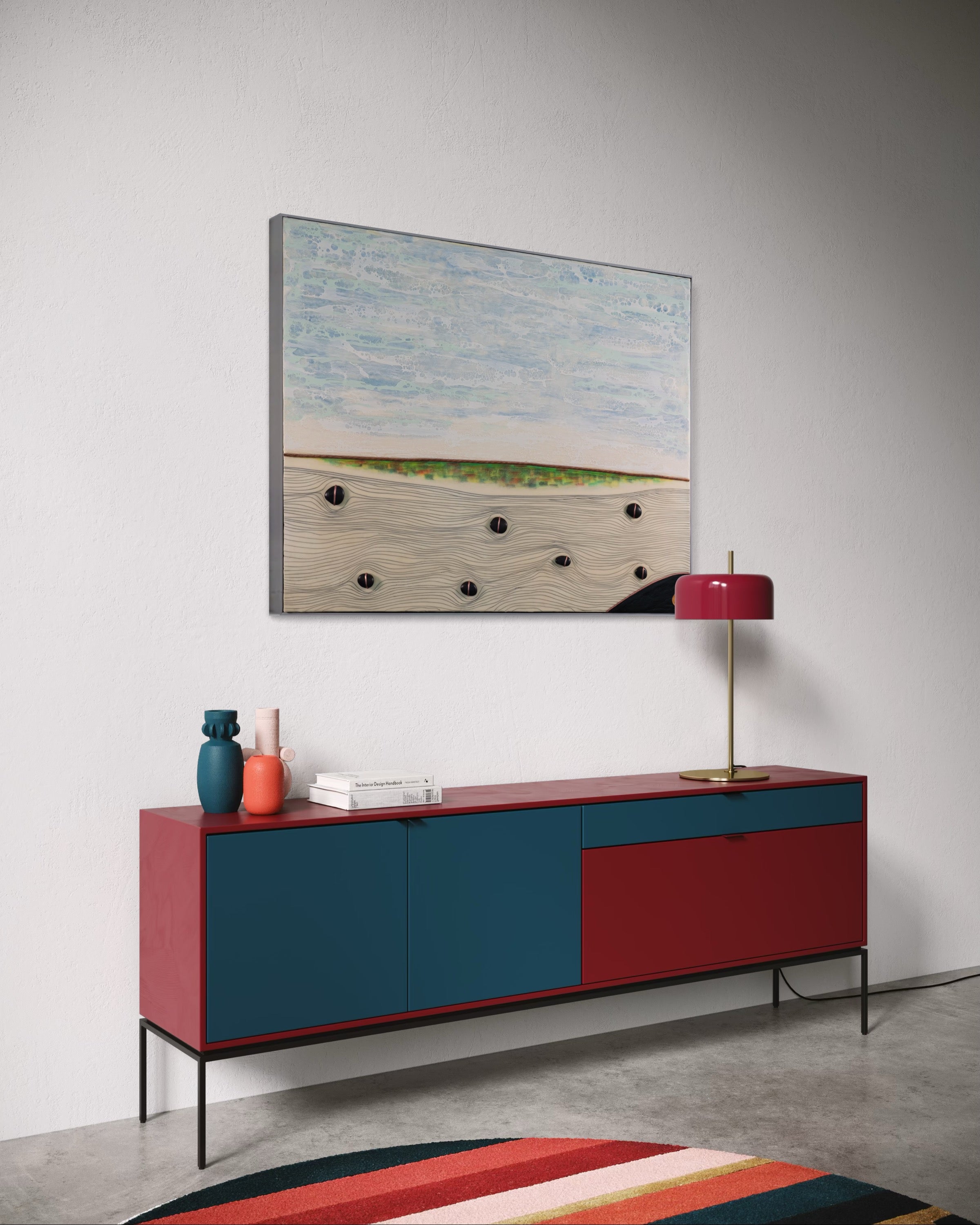 This romantic encaustic painting evokes the quiet poetry of a distant sea horizon. Black stones, each tenderly bound with copper wire, rest like whispered thoughts across the textured shore. A slender copper rod traces the meeting of sea and sky, grounding the soft, dreamlike blues above with a warm metallic glow. Crafted from raw, tactile materials, the piece radiates stillness and longing—an invitation to pause, breathe, and drift into calm.