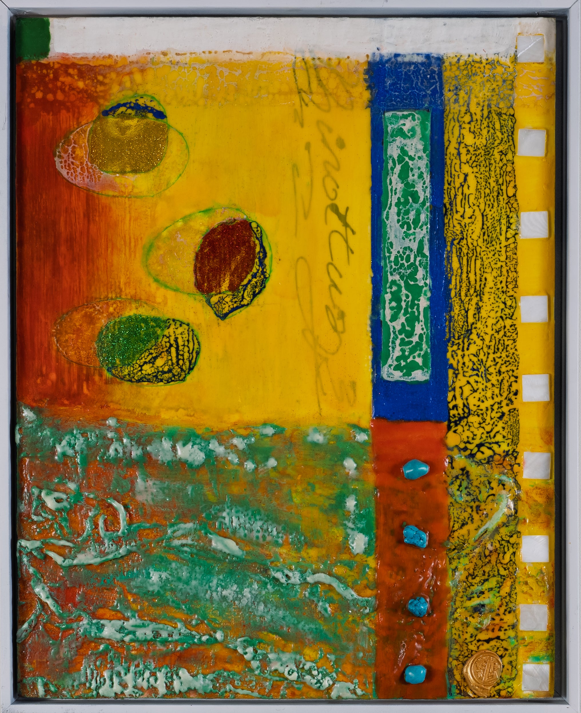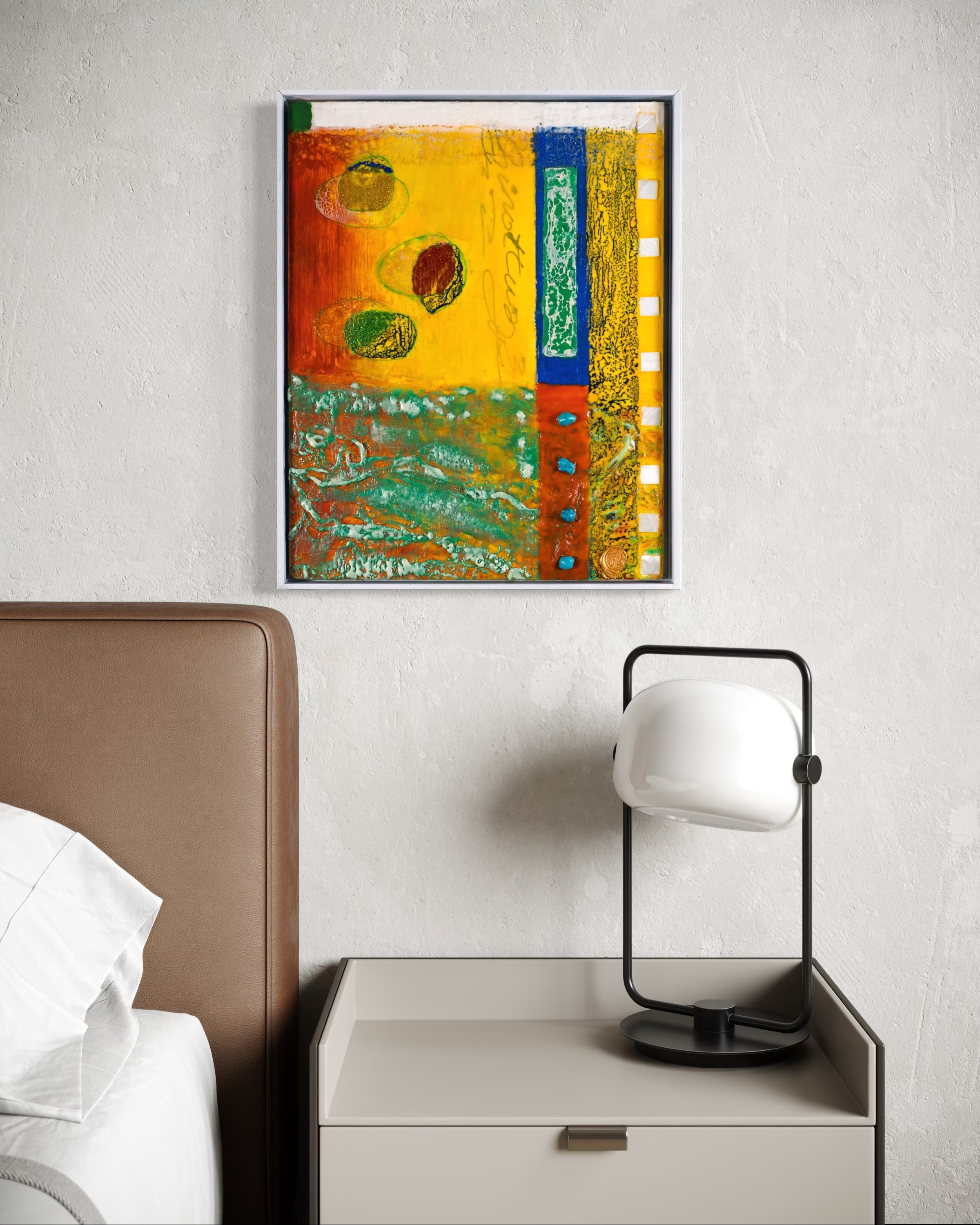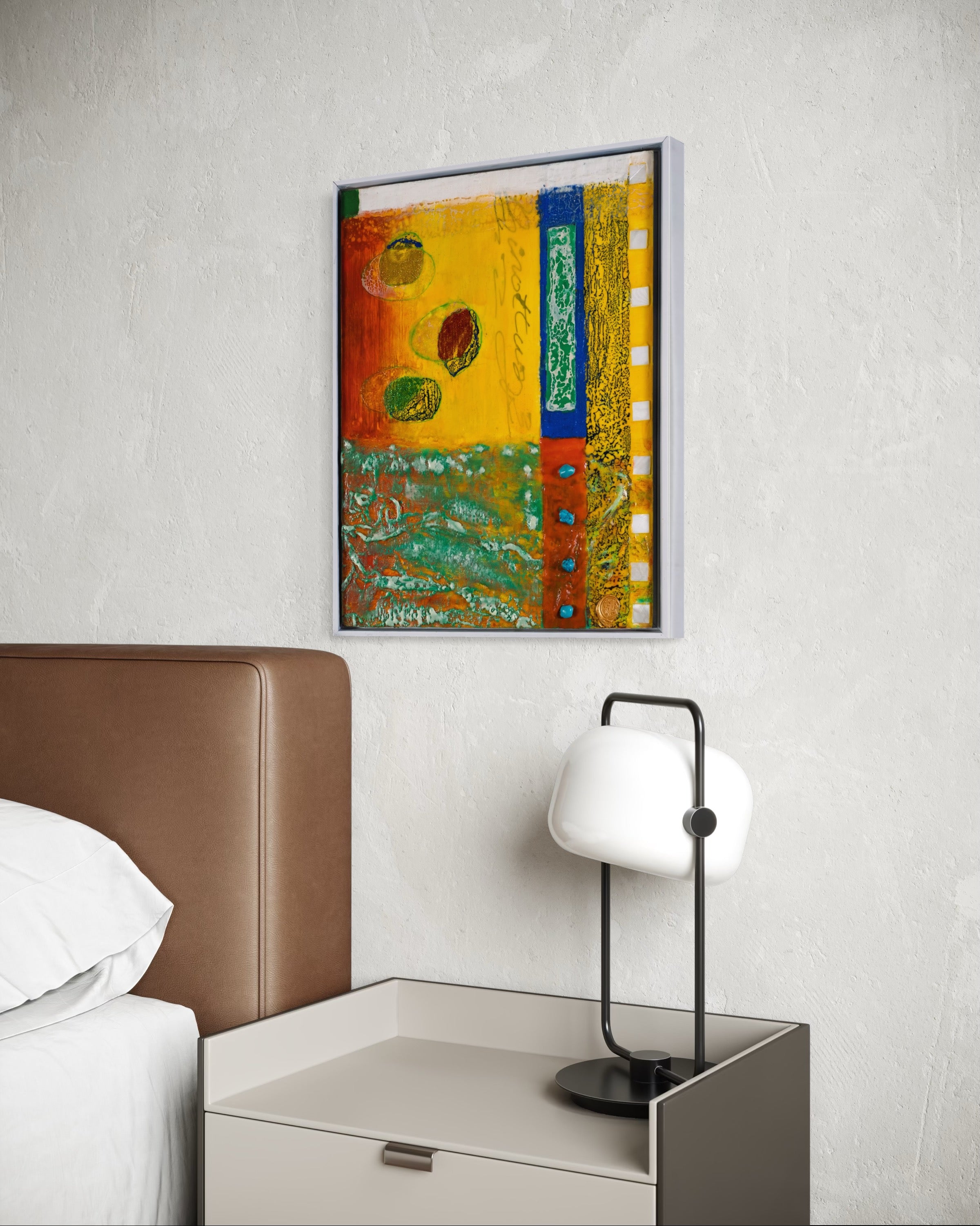 This painting contrasts bright colors and textured layers, with floating circles above and rough terrain below, balancing chaos and order, surface and depth. Vibrant yellows and greens interplay with a bold vertical band, inviting viewers to explore its dynamic layers and hidden stories.