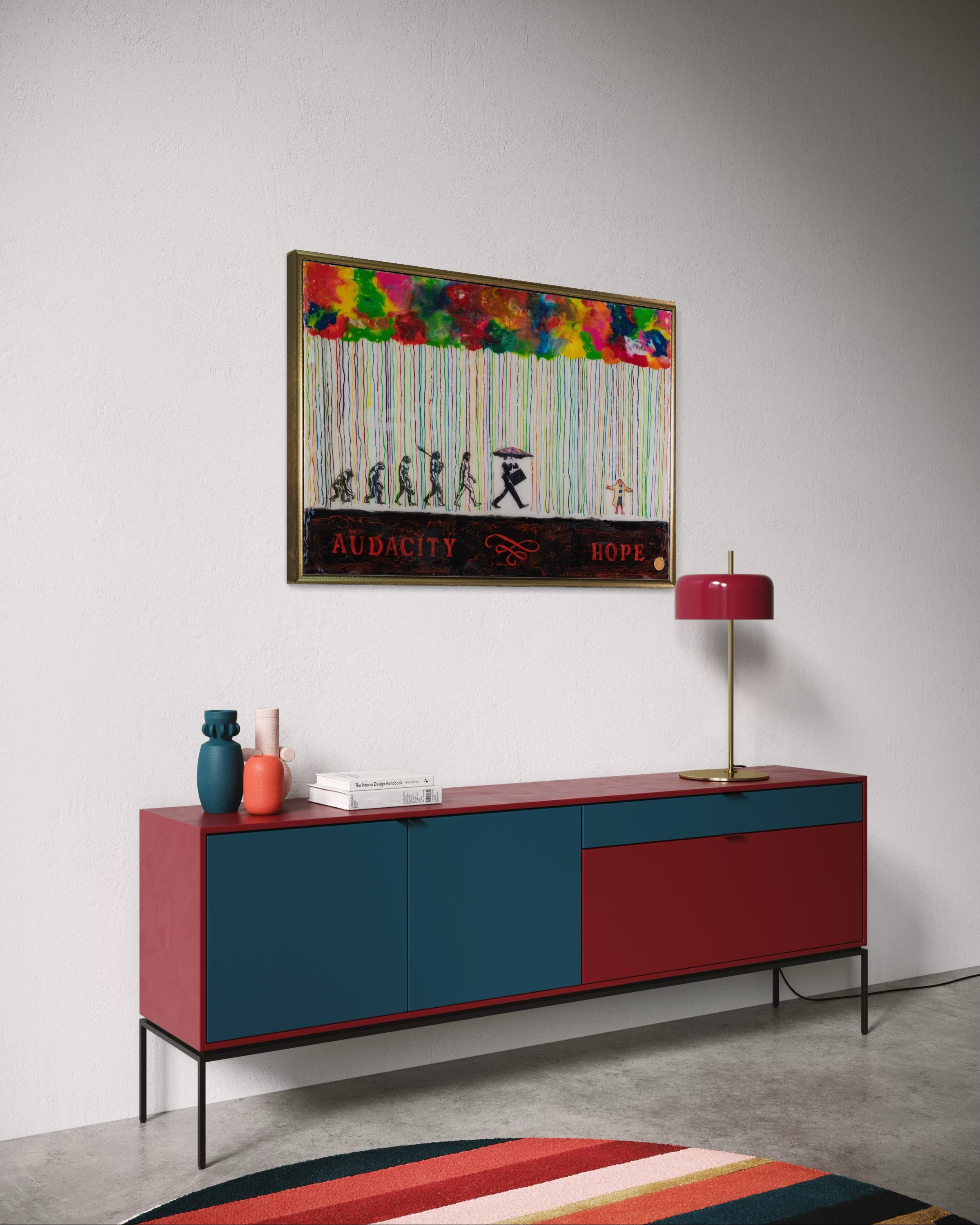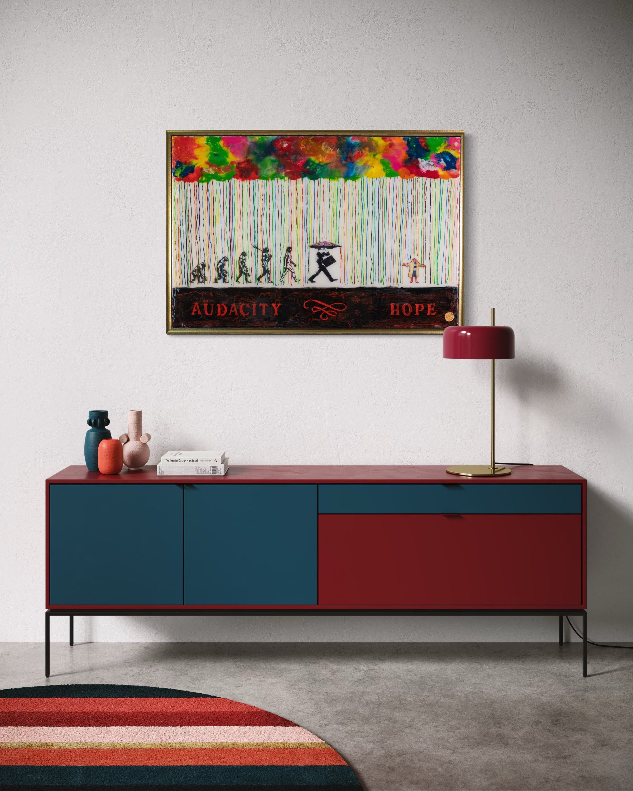 “Audacity and Hope,” this encaustic artwork beautifully captures the journey of humanity beneath a vibrant, celestial sky. Colorful clouds shower a cascade of hues—like life’s endless possibilities—while below, figures evolve from our primal ancestors to the modern, buttoned-up figure shielded by an umbrella. In our pursuit of progress, we’ve grown guarded and disconnected from the raw beauty of life that surrounds us. Yet, the child stands open and free, embracing the colorful rain, reminding us of our origins—and the bold, hopeful spirit we risk leaving behind beneath the expansive, glowing sky.